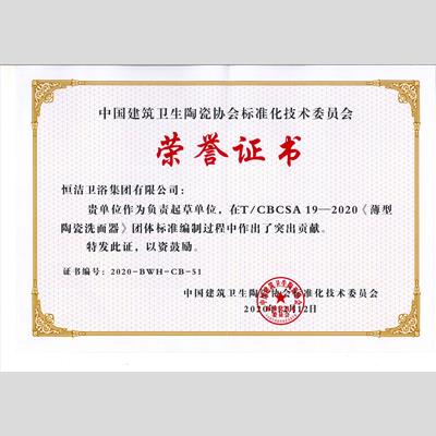 獎 項:TCBCSA 19-2020《薄型陶瓷洗面器》團體標準編制突出貢獻獎