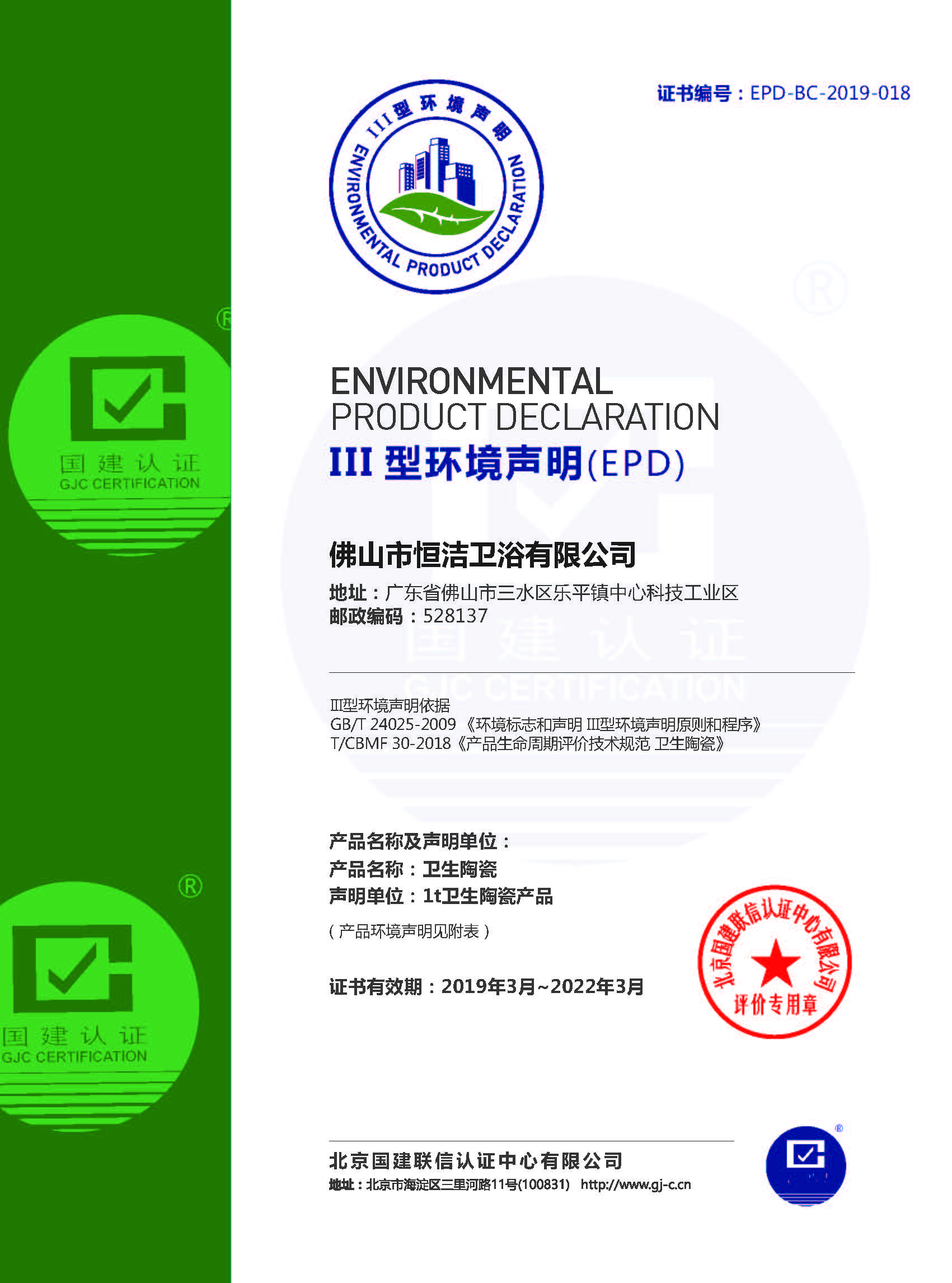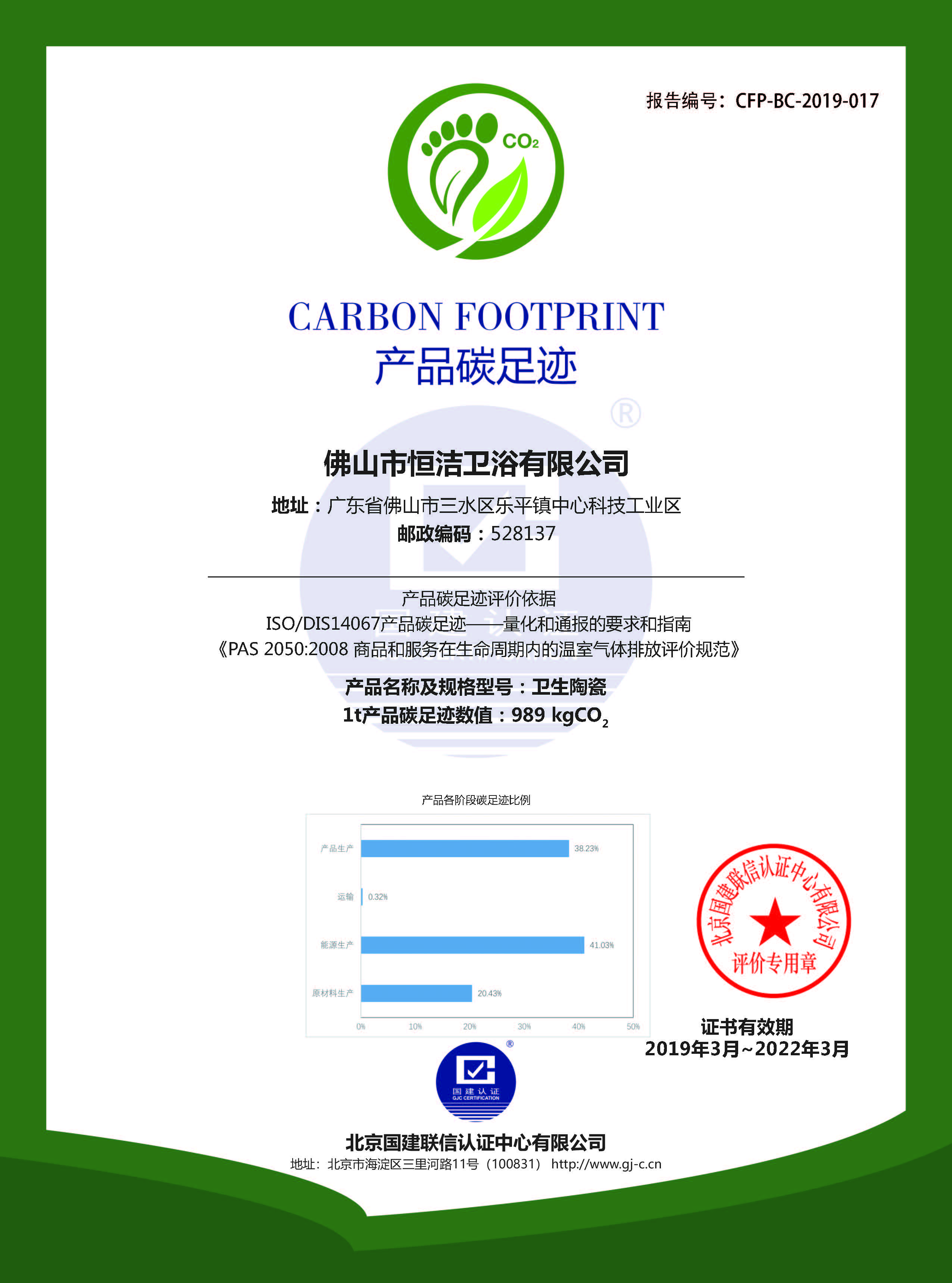 2020年3月24日,受佛山市恒潔衛浴有限公司(以下簡稱“恒潔衛浴”或“我公司”)委托,北京國建聯信認證中心有限公司對我公司進行了碳核查工作,并于4月10日出具了《佛山市恒潔衛浴有限公司2019年度溫室氣體排放核查報告》。