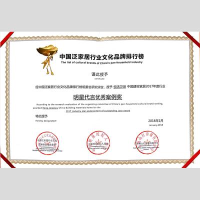 頒發單位:中國泛家居行業文化品牌排行榜組委會、中國明星經紀人協會、廣東咉山紅傳媒有限公司