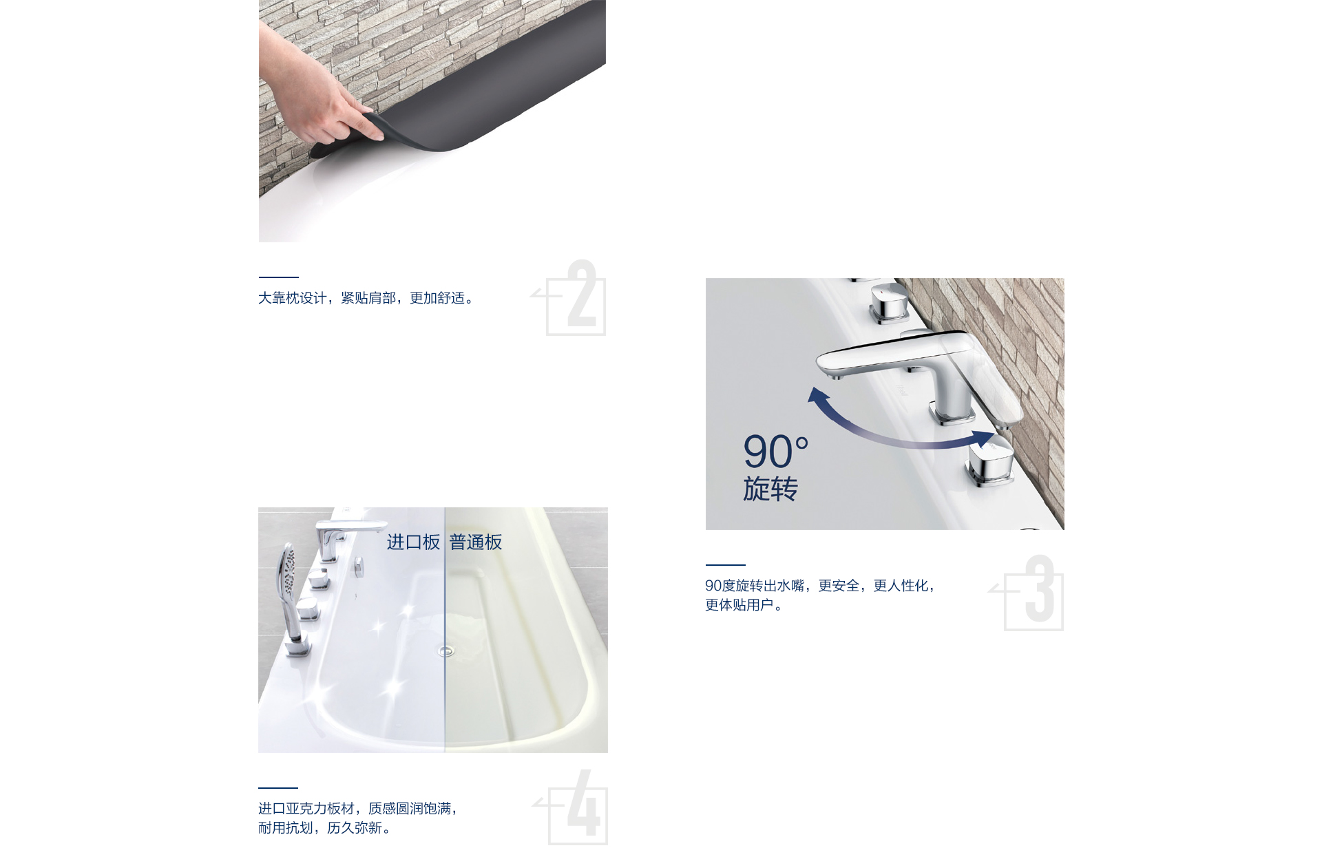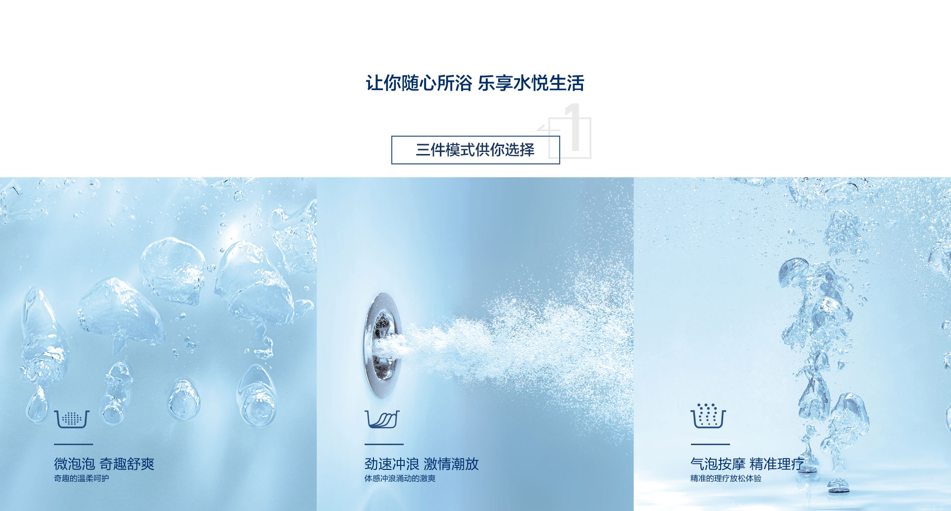 水療獨(dú)立按摩系統(tǒng)、勁速?zèng)_浪按摩系統(tǒng)、微泡泡按摩系統(tǒng)及汽泡按摩系統(tǒng)三件模式供你選擇,讓你隨心所浴,樂(lè)享水悅生活